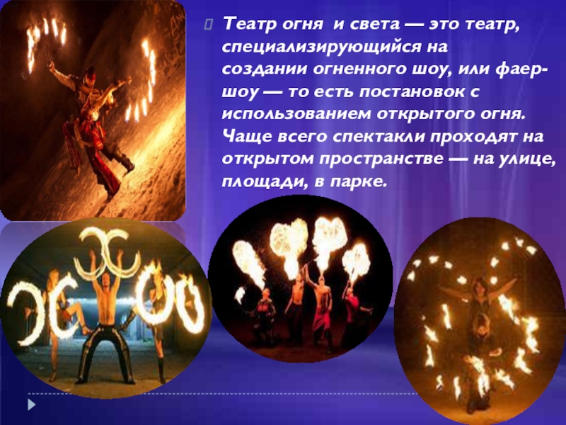 Слайд 7Театр огня  и света — это театр, специализирующийся на создании огненного шоу, или