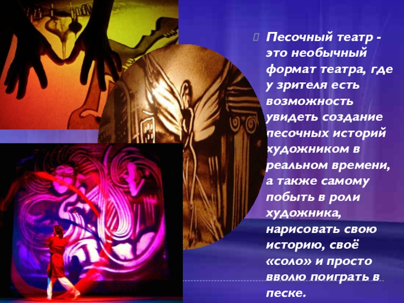 Песочный театр - это необычный формат театра, где у зрителя есть возможность увидеть создание песочных историй художником