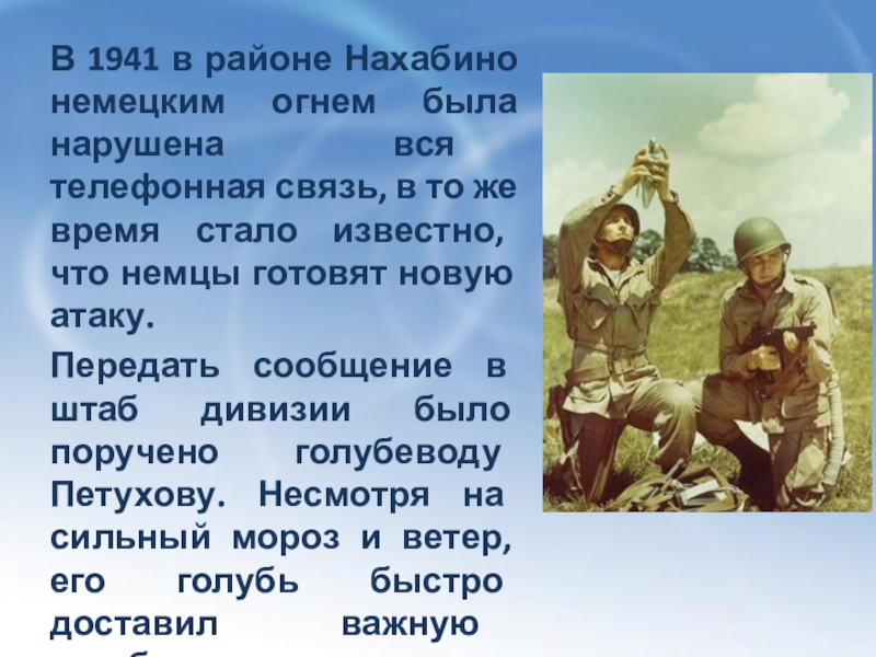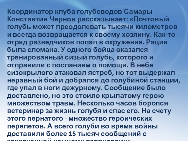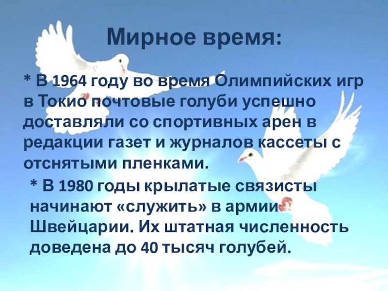* В 1980 годы крылатые связисты начинают «служить» в армии Швейцарии. Их штатная численность доведена до 40 тысяч голубей.