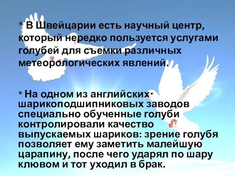 * На одном из английских шарикоподшипниковых заводов специально обученные голуби контролировали качество выпускаемых шариков: зрение голубя позволяет ему заметить малейшую царапину, после чего ударял по шару клювом и тот уходил в брак.