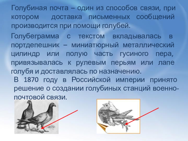 В 1870 году в Российской империи принято решение о создании голубиных станций военно-почтовой связи.