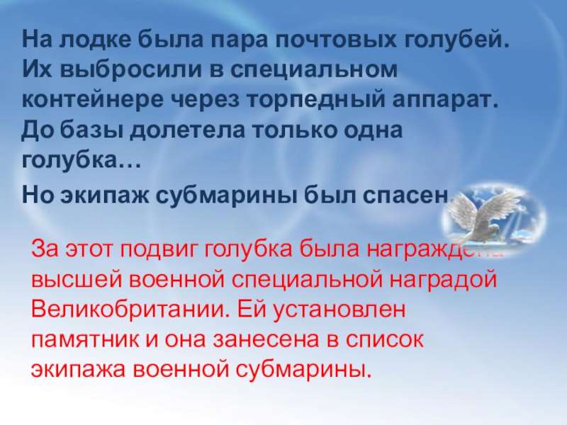 За этот подвиг голубка была награждена высшей военной специальной наградой Великобритании. Ей установлен памятник и она занесена в список экипажа военной субмарины.