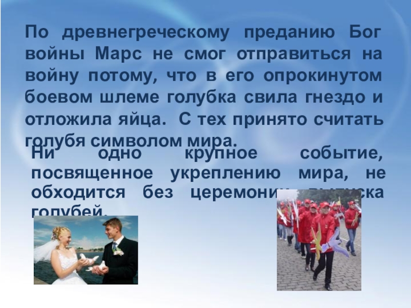 Ни одно крупное событие, посвященное укреплению мира, не обходится без церемонии выпуска голубей.