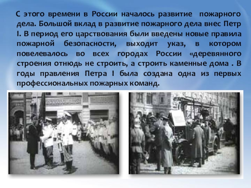 Слайд 8 С этого времени в России началось развитие пожарного дела. Большой
