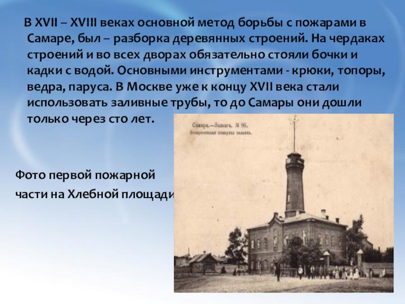 пожарами в Самаре, был – разборка деревянных строений. На чердаках строений и во всех дворах обязательно стояли бочки и кадки с водой. Основными инструментами - крюки, топоры, ведра, паруса. В Москве уже к концу XVII века стали использовать заливные трубы, то до Самары они дошли только через сто лет.