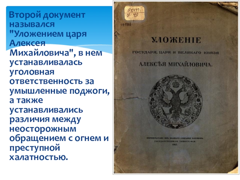 нем устанавливалась уголовная ответственность за умышленные поджоги, а также устанавливались различия между неосторожным обращением с огнем и преступной халатностью.