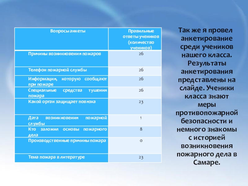 Результаты анкетирования представлены на слайде. Ученики класса знают меры противопожарной безопасности и немного знакомы с историей возникновения пожарного дела в Самаре.