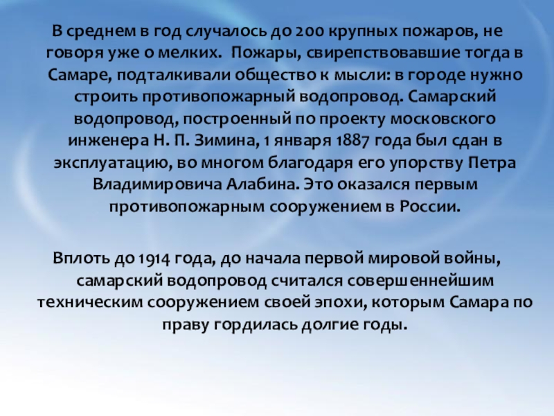 уже о мелких. Пожары, свирепствовавшие тогда в Самаре, подталкивали общество к мысли: в городе нужно строить противопожарный водопровод. Самарский водопровод, построенный по проекту московского инженера Н. П. Зимина, 1 января 1887 года был сдан в эксплуатацию, во многом благодаря его упорству Петра Владимировича Алабина. Это оказался первым противопожарным сооружением в России.