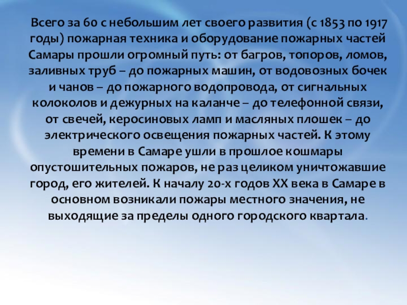 (с 1853 по 1917 годы) пожарная техника и оборудование пожарных частей Самары прошли огромный путь: от багров, топоров, ломов, заливных труб – до пожарных машин, от водовозных бочек и чанов – до пожарного водопровода, от сигнальных колоколов и дежурных на каланче – до телефонной связи, от свечей, керосиновых ламп и масляных плошек – до электрического освещения пожарных частей. К этому времени в Самаре ушли в прошлое кошмары опустошительных пожаров, не раз целиком уничтожавшие город, его жителей. К началу 20-х годов XX века в Самаре в основном возникали пожары местного значения, не выходящие за пределы одного городского квартала.