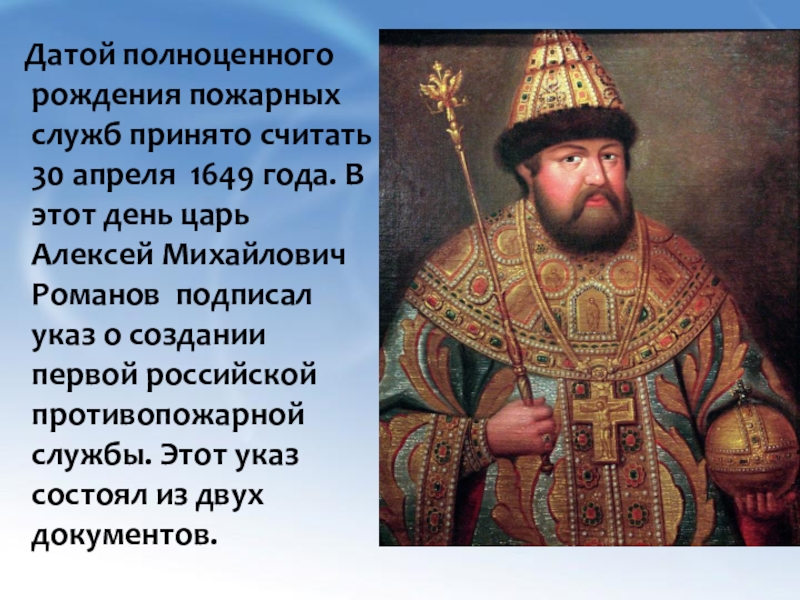 1649 года. В этот день царь Алексей Михайлович Романов подписал указ о создании первой российской противопожарной службы. Этот указ состоял из двух документов.