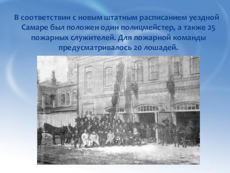 городскую полицию. Число пожарных команд и лошадей для каждого города определялось числом домов, то Самаре в те годы не полагался даже брандмейстер.