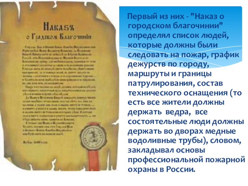 благочинии" определял список людей, которые должны были следовать на пожар, график дежурств по городу, маршруты и границы патрулирования, состав технического оснащения (то есть все жители должны держать ведра, все состоятельные люди должны держать во дворах медные водоливные трубы), словом, закладывал основы профессиональной пожарной охраны в России.