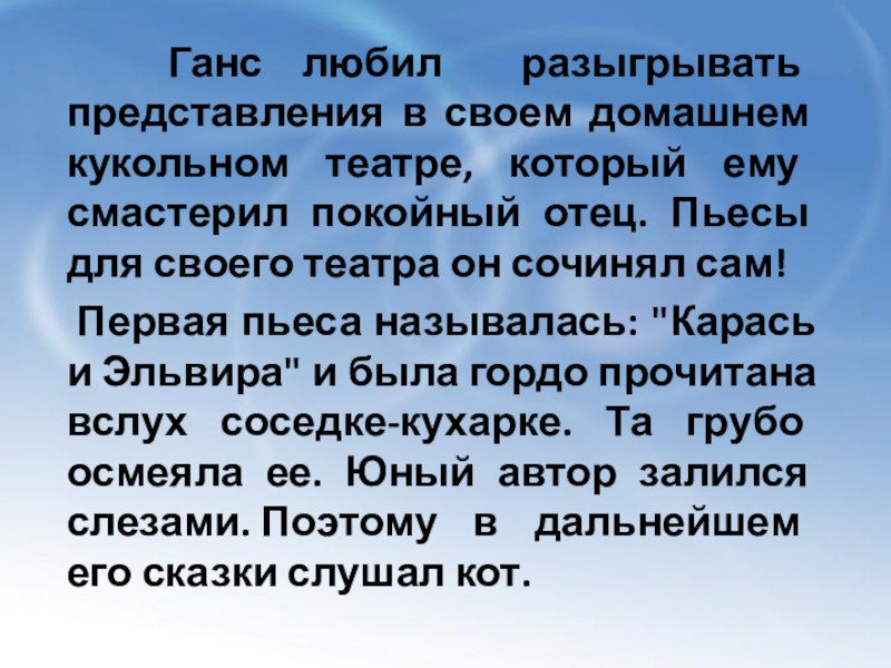Слайд 7 Ганс любил разыгрывать представления в своем домашнем кукольном театре,