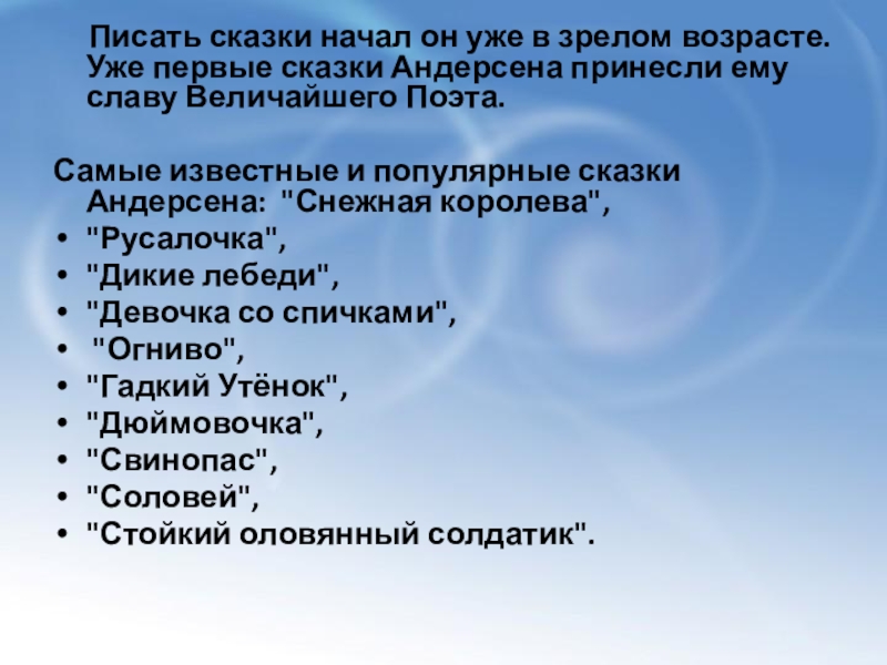 Слайд 9 Писать сказки начал он уже в зрелом возрасте.