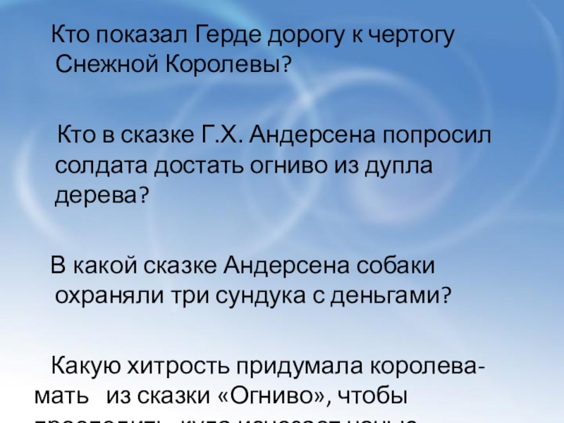 Слайд 18 Кто показал Герде дорогу к чертогу Снежной Королевы?
