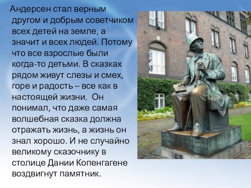 на земле, а значит и всех людей. Потому что все взрослые были когда-то детьми. В сказках рядом живут слезы и смех, горе и радость – все как в настоящей жизни. Он понимал, что даже самая волшебная сказка должна отражать жизнь, а жизнь он знал хорошо. И не случайно великому сказочнику в столице Дании Копенгагене воздвигнут памятник.