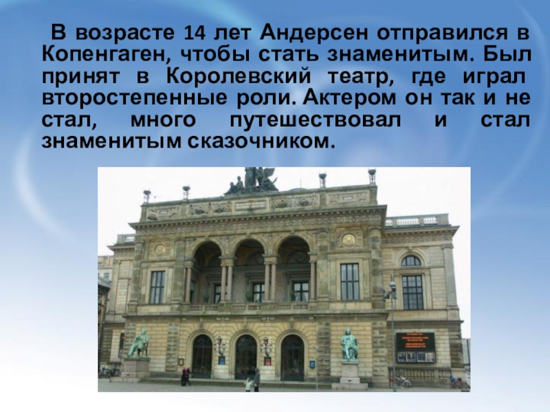 Слайд 8 В возрасте 14 лет Андерсен отправился в Копенгаген, чтобы