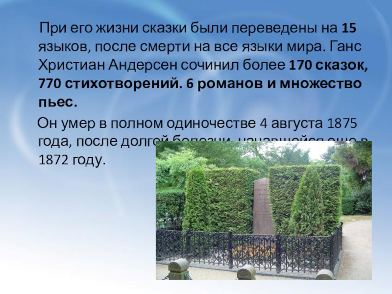 после смерти на все языки мира. Ганс Христиан Андерсен сочинил более 170 сказок, 770 стихотворений. 6 романов и множество пьес.
