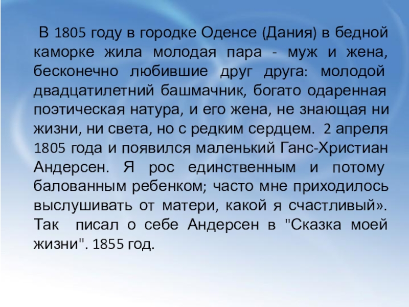 каморке жила молодая пара - муж и жена, бесконечно любившие друг друга: молодой двадцатилетний башмачник, богато одаренная поэтическая натура, и его жена, не знающая ни жизни, ни света, но с редким сердцем. 2 апреля 1805 года и появился маленький Ганс-Христиан Андерсен. Я рос единственным и потому балованным ребенком; часто мне приходилось выслушивать от матери, какой я счастливый». Так писал о себе Андерсен в "Сказка моей жизни". 1855 год.
