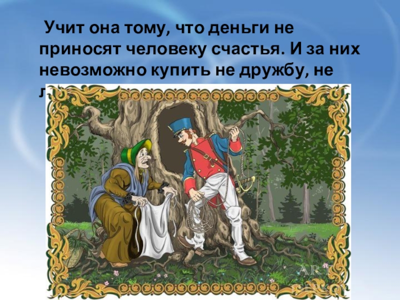 Слайд 13 Учит она тому, что деньги не приносят человеку
