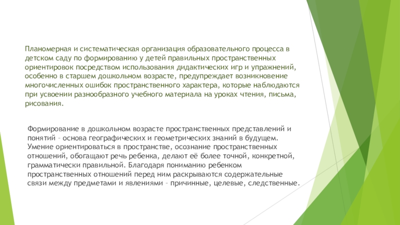 у детей правильных пространственных ориентировок посредством использования дидактических игр и упражнений, особенно в старшем дошкольном возрасте, предупреждает возникновение многочисленных ошибок пространственного характера, которые наблюдаются при усвоении разнообразного учебного материала на уроках чтения, письма, рисования.