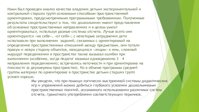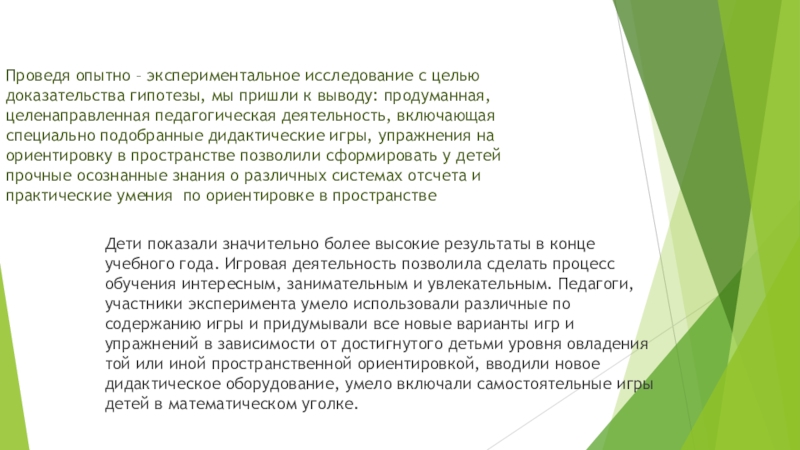 Дети показали значительно более высокие результаты в конце учебного года. Игровая деятельность позволила сделать процесс обучения интересным, занимательным и увлекательным. Педагоги, участники эксперимента умело использовали различные по содержанию игры и придумывали все новые варианты игр и упражнений в зависимости от достигнутого детьми уровня овладения той или иной пространственной ориентировкой, вводили новое дидактическое оборудование, умело включали самостоятельные игры детей в математическом уголке.
