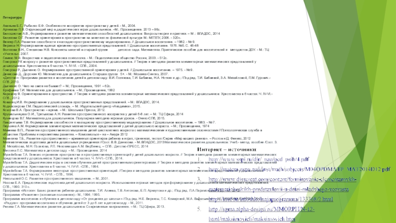Мусейибова Т.А. Дидактические игры в системе обучения детей пространственным ориентировкам. // Теория и методика развития элементарных математических представлений у дошкольников: Хрестоматия в 6 частях. Ч. IV-VI. -СПб., 1994.