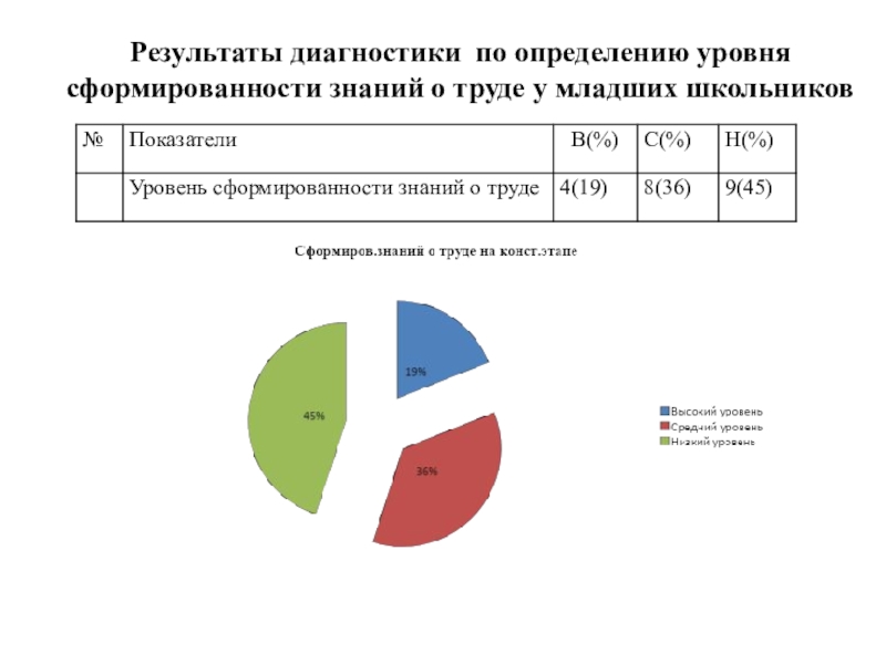 Слайд 9Результаты диагностики по определению уровня сформированности знаний о труде у младших