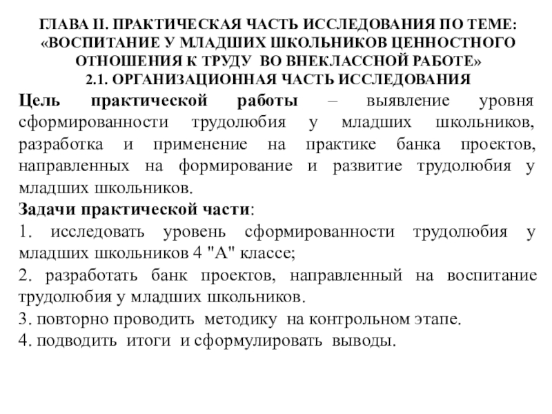 Цель практической работы – выявление уровня сформированности трудолюбия у младших школьников, разработка и применение на практике банка проектов, направленных на формирование и развитие трудолюбия у младших школьников.