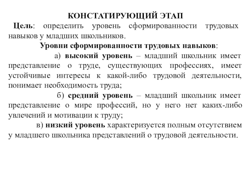 в) низкий уровень характеризуется полным отсутствием у младшего школьника представлений о трудовой деятельности.