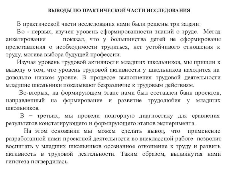 На этом основании мы можем сделать вывод, что применение разработанной нами проектной деятельности во внеклассной работе позволит воспитать у младших школьников осознанное отношение к труду и развить активность в трудовой деятельности. Таким образом, выдвинутая нами гипотеза потвердилась.