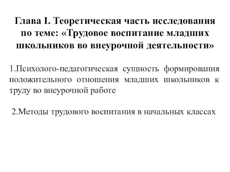 Слайд 5Глава I. Теоретическая часть исследования по теме: «Трудовое воспитание младших школьников