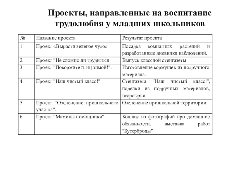 Слайд 12Проекты, направленные на воспитание трудолюбия у младших школьников