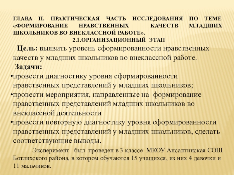 Слайд 7ГЛАВА II. ПРАКТИЧЕСКАЯ ЧАСТЬ ИССЛЕДОВАНИЯ ПО ТЕМЕ «ФОРМИРОВАНИЕ НРАВСТВЕННЫХ КАЧЕСТВ МЛАДШИХ