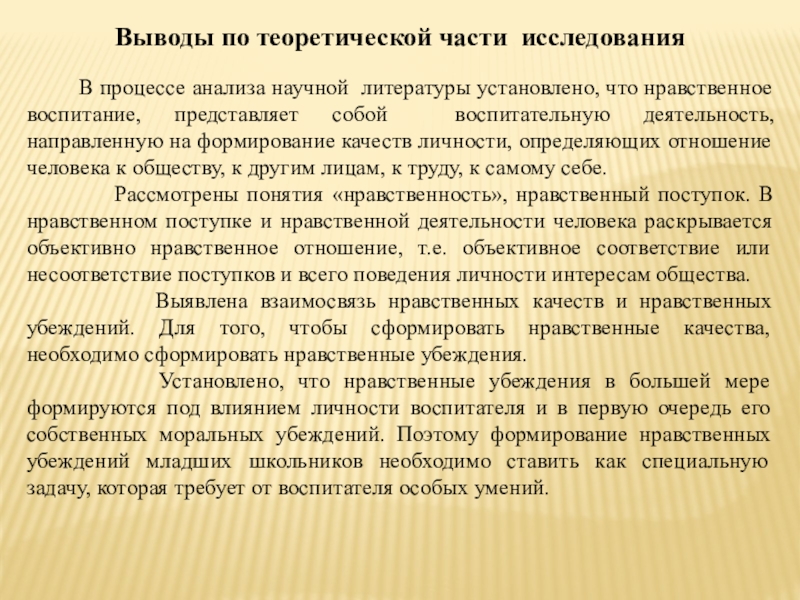 Установлено, что нравственные убеждения в большей мере формируются под влиянием личности воспитателя и в первую очередь его собственных моральных убеждений. Поэтому формирование нравственных убеждений младших школьников необходимо ставить как специальную задачу, которая требует от воспитателя особых умений.