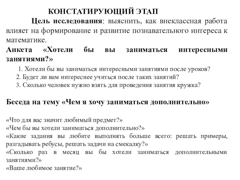 Цель исследования: выяснить, как внеклассная работа влияет на формирование и развитие познавательного интереса к математике.