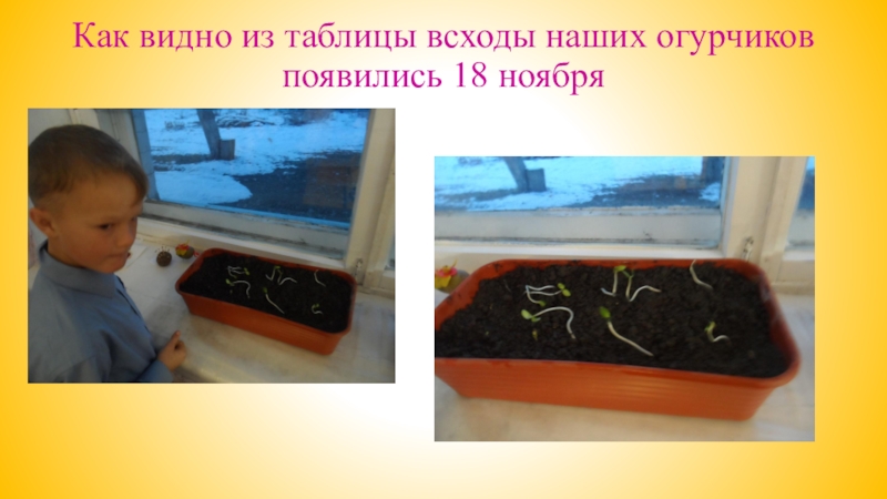Слайд 23Как видно из таблицы всходы наших огурчиков появились 18 ноября