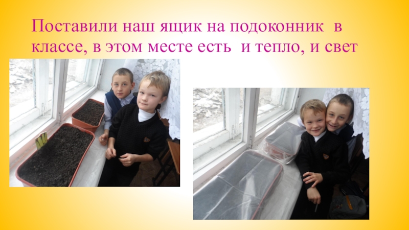 Слайд 21Поставили наш ящик на подоконник в классе, в этом месте есть