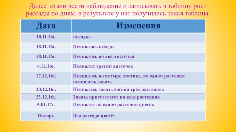 Слайд 22Далее стали вести наблюдение и записывать в таблицу рост рассады по