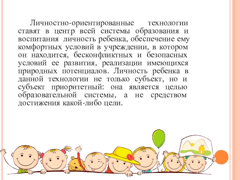 Личностно-ориентированные технологии ставят в центр всей системы образования и воспитания личность ребенка, обеспечение ему комфортных условий в