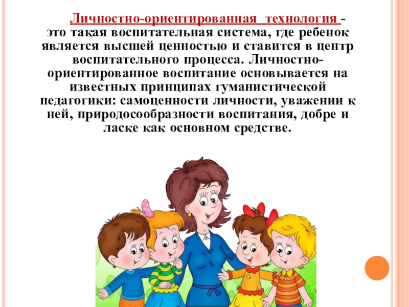 ребенок является высшей ценностью и ставится в центр воспитательного процесса. Личностно-ориентированное воспитание основывается на известных принципах гуманистической педагогики: самоценности личности, уважении к ней, природосообразности воспитания, добре и ласке как основном средстве.