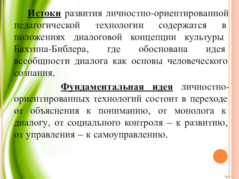 Истоки развития личностно-ориентированной педагогической технологии содержатся в положениях диалоговой концепции культуры Бахтина-Библера, где обоснована