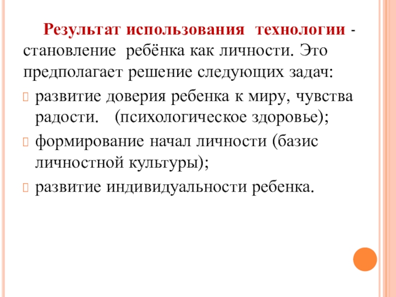Результат использования технологии -  становление ребёнка как личности. Это предполагает решение следующих задач: развитие доверия