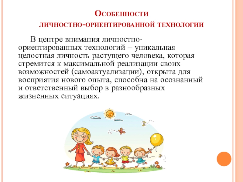 Особенности  личностно-ориентированной технологии	В центре внимания личностно-ориентированных технологий – уникальная целостная личность растущего человека, которая стремится к