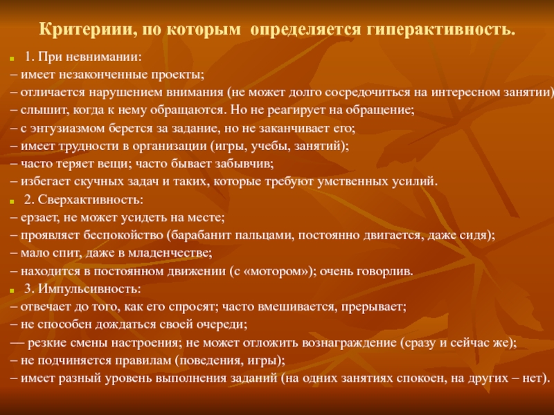Слайд 4Критериии, по которым определяется гиперактивность.