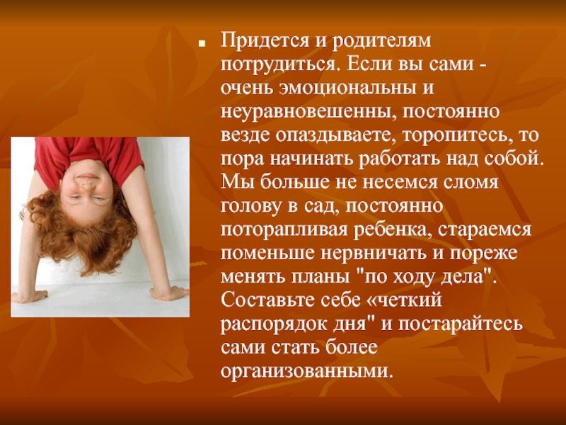 неуравновешенны, постоянно везде опаздываете, торопитесь, то пора начинать работать над собой. Мы больше не несемся сломя голову в сад, постоянно поторапливая ребенка, стараемся поменьше нервничать и пореже менять планы "по ходу дела". Составьте себе «четкий распорядок дня" и постарайтесь сами стать более организованными.