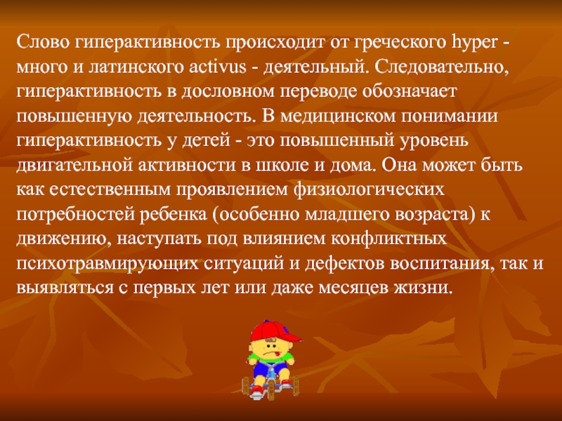 Слово гиперактивность происходит от греческого hyper - много и латинского activus - деятельный. Следовательно, гиперактивность в дословном переводе обозначает повышенную деятельность. В медицинском понимании гиперактивность у детей - это повышенный уровень двигательной активности в школе и дома. Она может быть как естественным проявлением физиологических потребностей ребенка (особенно младшего возраста) к движению, наступать под влиянием конфликтных психотравмирующих ситуаций и дефектов воспитания, так и выявляться с первых лет или даже месяцев жизни.