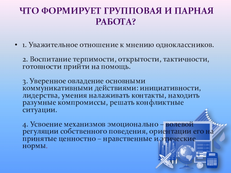 учебно-организационные умения, коллективные взаимоотношения. На учебных занятиях с использованием групповой работы каждый трудится в меру своих способностей в атмосфере согласованного взаимодействия учащихся и учителя, что повышает мотивацию обучения.