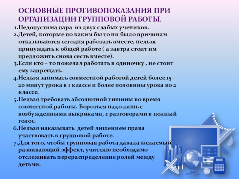 Нельзя занимать совместной работой детей более 15 – 20 минут урока в 1 классе и более половины урока во 2 классе.