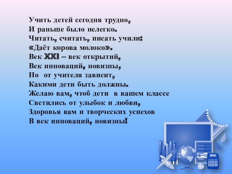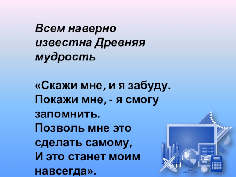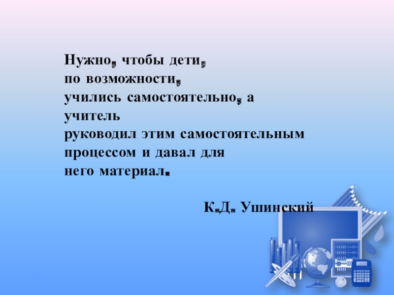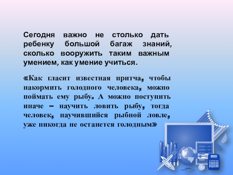 Слайд 4Сегодня важно не столько дать ребенку большой багаж знаний, сколько вооружить
